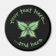Butterfly icon composed of green mint leaves. Custom background colour. Two custom text fields on circle.
