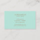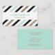 Very elegant striped business card with glitter gold, mint and black stripes on a white background and a name w title on a horizontal rectangle in the middle. All information is on the back with mint background, elegant font in gold tone.