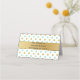 Pretty folded place card done in a mint green and gold on white small polka dot pattern. Graphics of a gold tone ribbon, runs across the front and back of the card. Personalise the custom text, on the back of the card to read what you want. Personalise the front of each card, by hand, for your wedding reception.