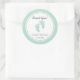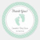 Round sticker for baby shower favour with mint green baby feet design and polkadot background.