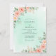 This design features a soft mint green watercolor background that creates a tranquil and romantic atmosphere. Delicate peach roses are clustered elegantly in the corners, complemented by muted sage green eucalyptus leaves. The palette blends pastels and earthy tones, perfect for a fresh spring or outdoor botanical event.