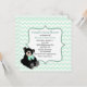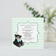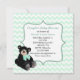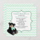 Sweet square couple's baby shower invitation, done in a mint green and white chevron pattern, with a decorative mint green framed white text area, in the middle. Graphics of a sweet black teddy bear with a pretty mint green bow decorates the lower left corner of the invitations. Personalise all the text for your baby shower, for a elegant invitation the new parents will love.
