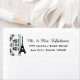 ADD YOUR NAME TO THESE CHIC AND PRETTY PARISIAN AND FRENCH THEMED RETURN ADDRESS LABELS WITH AN EIFFEL TOWER ON AN ELEGANT BLACK AND WHITE DAMASK FLORAL BACKGROUND AND A PRINTED RIBBON LOOK DESIGN IN A LIGHT GREEN MINT HUE. DESIGNED BY CHRISSY H. STUDIOS, LLC. ALL RIGHTS RESERVED.