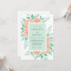 This design features a soft watercolor palette of mint green and peach. Delicate peach roses are nestled among lush sage green leaves and sprigs of greenery. The aesthetic is romantic and airy, perfect for a sunny spring outdoor event. The artistic brushstrokes create a gentle, natural atmosphere.