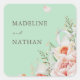 These feminine and pretty floral envelope seals feature peach and white flowers with greenery and white ribbons on top of a mint green background. This would suit anyone looking to add a romantic and feminine touch to their envelopes. Personalise the seals with the names of the bride and groom.
