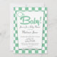 A cute mint green "Oh Baby" gender neutral baby shower invitation featuring a checked mint and white background.