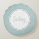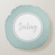 This nautical themed round throw pillow with text 'Sailing' on a soft mint background goes perfectly with the Mint Green Sailboat and Clouds duvet cover, and would be wonderful in a bedroom with fresh coastal decor.