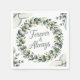 A delicate wedding greeting card featuring a beautifully detailed watercolor eucalyptus wreath rendered in shades of mint green and sage green, encircling a subtle, textured white background. The wreath incorporates scattered sprigs of baby's breath and tiny pearl-like accents, creating an elegant and slightly rustic feel, with a soft glow enhancing the watercolor effect. Across the centre of the wreath, the text “FOREVER & ALWAYS” is displayed in a flowing, modern script font in a soft silver-grey, complementing the natural tones and evoking a sense of timeless romance. The card’s interior provides ample space for a heartfelt message and incorporates a simplified eucalyptus sprig illustration in the bottom corner, maintaining the serene and celebratory emotional tone.