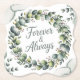 A delicate wedding greeting card featuring a beautifully detailed watercolor eucalyptus wreath rendered in shades of mint green and sage green, encircling a subtle, textured white background. The wreath incorporates scattered sprigs of baby's breath and tiny pearl-like accents, creating an elegant and slightly rustic feel, with a soft glow enhancing the watercolor effect. Across the centre of the wreath, the text “FOREVER & ALWAYS” is displayed in a flowing, modern script font in a soft silver-grey, complementing the natural tones and evoking a sense of timeless romance. The card’s interior provides ample space for a heartfelt message and incorporates a simplified eucalyptus sprig illustration in the bottom corner, maintaining the serene and celebratory emotional tone.
