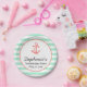 Mint green stripes with coral pink nautical anchor birthday party paper plate. The design features a mint green and white striped pattern, a white circle with a coral pink anchor and your custom text.