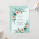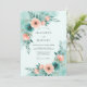 This design features a serene watercolor aesthetic with a refreshing palette of mint green, teal, and soft peach. Delicate peach roses and vibrant teal anemones are arranged in graceful clusters. The light seafoam background creates an airy and romantic atmosphere, perfect for an outdoor spring or summer event.