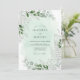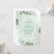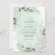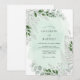 A soft wash of mint green watercolor creates a tranquil and ethereal backdrop for this botanical design. Delicate eucalyptus leaves and wispy fern fronds border the edges in natural shades of sage and forest green. This organic arrangement of greenery evokes a serene woodland atmosphere, blending a painterly aesthetic with a fresh, earthy color palette.