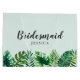 Trendy bridesmaid gift bag design featuring tropical watercolor monstera and palm leaves on a mint green background.