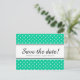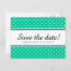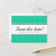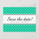Simple save the date postcards with mint green and white polka dots pattern. Modern chic polkadot print design for elegant wedding party. Trendy and fun contemporary style. Custom background colour shade and personalised template text on the back. Change the quantity to get the cheapest price per card.