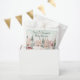 A mint and pink watercolor Fairytale Winter scene with cosy homes, Christmas trees and snow in awaitance of a little snowflake! Personalise the Name and Date on it and it's ready to be offered with a favour to your Guests!