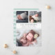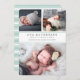 Announce your sweet baby's arrival with our photo collage birth announcements featuring elegant grey lettering and pastel mint green details. Flat cards feature three of your favourite newborn photos -- two at the top, and one at the bottom -- with baby's name, birth stats and family names in chic charcoal grey, framed by two thin bands of mint green. Cards reverse to mint and white stripes.
