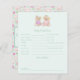 Have your baby shower guests fill out this cute baby predictions and advice card that features a cute hand drawn illustration of two teddy bears wearing fancy dresses and hats and having a tea party. This adorable teddy bear tea party themed advice card makes for a wonderful keepsake and is a fun activity for your tea party themed baby shower! The back of this card features a hand painted mint green watercolor rose, teacups, and teapots pattern that is girly and whimsical.