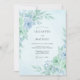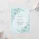 This design features a soft watercolor palette of mint teal and light blue. Delicate roses are surrounded by silver dollar eucalyptus leaves and subtle berry sprigs, creating an ethereal and airy atmosphere. Perfect for a refreshing spring or summer morning event, the artwork evokes a sense of tranquil romance and natural beauty.