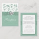 This modern and romantic mint green and white floral wedding reception enclosure insert card has a PRINTED sage green ribbon with a pair of PRINTED green and silver grey hearts the word "Love" on it in a vintage style font that matches the wedding invitation shown below. All text is customisable. You can use this card as a directions or accommodations card, a gift registry card, wishing well card, wedding website card, or information card, ****PLEASE NOTE there are no raised elements on this card. Everything is printed flat. ***PLEASE NOTE that if you change the font or size of the font, it may alter how your card prints. It will print the way you see it on your monitor, so if you have alignment issues, or sizing problems, please contact me for help. I will not see your card once you order it, and Zazzle will NOT edit anything (typos, alignment, etc.). If you require assistance or would like any other matching items, please email your request to niteowlstudio@gmail.com.