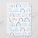 Cute and whimsical baby shower invitation template card featuring a hand painted blue rainbow with stars around. The text says "after every storm there is a rainbow." The pattern on the back of the card has clouds and raindrops. This modern design is perfect for a boy's miracle baby shower especially after a mother has gone through a miscarriage before.