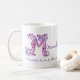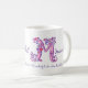 Hand drawn letter M name and meaning mug. Pretty heart and flower capital M doodled typographic design featuring hearts and flowers and the words Miranda Wonderful she who should be admired in pink and purple. © Unique art and design by Sarah Trett. www.sarahtrett.com for www.mylittleeden.com on zazzle