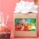 Colourful, whimsical and vibrant Venetian masquerade character. Beautiful sophisticated blonde woman is sitting with a red rose and a feathered mask in hand with sparkling gold fuchsia fabrics of a baroque masked ball costume with feathers and a dog. Watercolor painting with bright colours in ,yellow blue pink, green,gold sparkles and silver foil , inspired from characters of Comedy of Art ( Commedia dell' Arte ) , Carnival of Venice and Venetian feather masks.This cool and artistic design is also a beautiful gift for special occasions ,birthdays ,christmas, holiday,Valentine's Day,Mardi Gras ( Fat Tuesday ) season.
