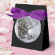 Black tent-style with purple ribbon favour box with an image of a dazzling mirrored disco ball. Change the ribbon to silver for a more elegant look. See the entire Disco 70s Favour Box collection in the PARTY FAVORS section.