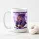 This design showcases a bohemian-styled witch with luxurious purple hair that cascades around her shoulders, wearing a unique, floppy purple witch’s hat, subtle black swirls are painted across her face. She holds a rolled-up map to her lips with a mysterious smirk, hinting at mischief, while her other hand cradles a warm cup of coffee. Behind her, bursts of purples, violets, and lilacs fill the background in vibrant explosions, giving her an aura of enchantment. Above her, the phrase "Mischief Managed" floats in a bold, whimsical script, a playful nod to the magical Marauder's Map from Harry Potter, while below her reads, "After my coffee," making it clear that even mischief needs a little caffeine boost. This design captures a magical yet playful vibe for those who need coffee before their day truly begins.