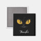 A cute and mischievous looking black cat with big almond shaped yellow orange eyes and cute little white fangs blending into a black background. Thanks written in a fancy white font.