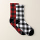 Mismatched buffalo plaid socks in red and grey tones for cheerful holidays.