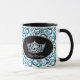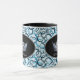 This two-tone mug has a black handle and black interior. Blue colours swirl background over white mug features ovals on each side with a very-very light steel blue pageant crown in the centre of the ovals bordered by grey. Personalised text underneath each crown for you to customise. Text sample shown in "Miss Montana".