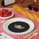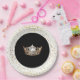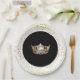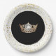These paper plates are shown in a cute print of petite Golden coloured stars all about the White rim and a gleaming Gold Crown in the Black centre.