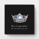 An award for any one who wishes to have a crown on it. Shown in a 5x7" size this plaque is a real stand-up award for your pageant winners, contestants or even best mum. Created in a sleek Black background with light Silver-Grey text specifying the award of your choice which you can customise. Buy as is or change the pageant name of course to your own as well as the award category. Plaque has stand attached and an image of a Gleaming Silver Crown. Scratch resistant coating makes this item a real winner.