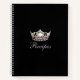 This spiral recipe notebook is shown in sleek Black with a print of a gleaming Silver crown on the cover and has great layout for your ease of adding in your own recipes. Beneath the crown is the word recipes in fancy script. Back cover in solid colour of Black with a small silver crown at bottom.