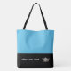 This cute stylish large tote bag is shown in a Blue and Black colour block style with a pageant crown and custom text.