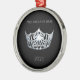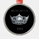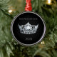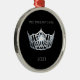 Christmas ornament shown in a round shape with a pretty Silver crown, with text of Silver-Grey and Black colour background. Shown with red ribbon and silver rimmed. Customise this item with your personal pageant name, date or other.