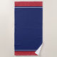 This beach towel is shown in a Navy Blue towel with ends in Red faux glitter colour and a coordinating solid stripe.