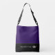 This cute stylish medium size cross body tote bag is shown in a Blackberry [ deep purple] and Black colour block style with a pageant crown and custom text. Thin accent stripe.