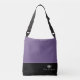 This cute stylish medium size cross body tote bag is shown in a colour called Grape Compote and Black colour block style with a pageant crown and handwritten custom text. Thin accent stripe.