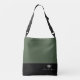 This cute stylish medium size cross body tote bag is shown in a Chive Green and Black colour block style with a pageant crown and handwritten custom text. Thin accent stripe.