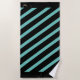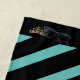 Aqua Blue stripes mingle with sexy Black on this beach towel. Both ends have space for customisation and feature a fancy swirl pale Golden-colour crown print on each end of the towel. Customise or buy as designed.