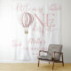This charming first birthday party photo backdrop features a cute pink hot air balloon and clouds, along with elegant script typography. Designed by Thisisnotme©
