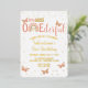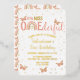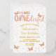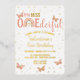 Customisable whimsical boho design for girl's first Birthday celebration "Little Miss ONEderful" in soft peachy pastel pink and faux gold colours with glitter butterflies, a modern rainbow, and faux glitter hearts.