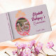 Guest book for Quinceanera 15th birthday party features butterflies crown and letter Q squiggle with personalised texts and photo of the quince.