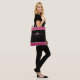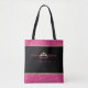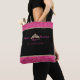 This tote bag is shown in faux hot pink and gold coloured glitter band at top and bottom with black strap handles. Black bag and on both sides is an attractive crown with faux hot pink colour stones. Text reads " Future Miss Rodeo in training".