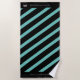 This beach towel is shown in a Black background with bold Aqua colour stripes and with a print of a gleaming Silver pageant crown. Has sample text for you to personalise with your own name or title.
