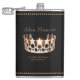 A bit of home comfort anywhere you go to celebrate in style. Bold Gold crown printed on front only, along with text for you to customise with your own. Gold coloured diamond pattern atop and bottom of flask. Silver, Black and Gold colourings. Miss USA style crown.