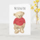 Have you been thinking about someone that you haven't seen in a while? Let them know that you care with this simple yet sweet "Missing You" teddy bear watercolour card. A sad-looking teddy bear wearing a red knit sweater sits in the front of the card, glancing forlornly at the recipient. The same teddy bear peeks up at the viewer on the inside of the card below the text, "Hope to see you soon!"