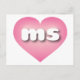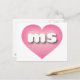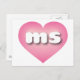 This postcard features a pink heart with a white-washed centre containing the bold, white, lower case letters ms, a playful version of the abbreviation for Mississippi, the magnolia state. The reverse side of the postcard is blank, awaiting your customised text and handwritten sentiments.