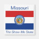 An authentic fine quality image of the flag of Missouri set between the state name and nickname over a flag-colour background.